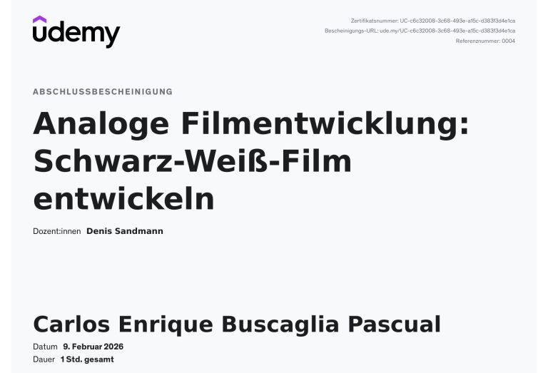 Diese Seite zeigt ausgewählte Weiterbildungen und Qualifikationen, die meine technische, gestalterische und handwerkliche Entwicklung begleiten – von digitaler Fotografie bis hin zu analogen Verfahren.